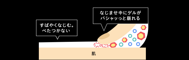 ベタつきやすい高保湿油分を「崩壊性ゲル」に閉じ込めて、みずみずしい高分子乳化ジェルに配合。